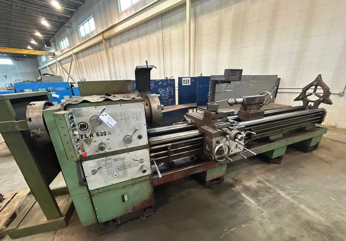 TUR 630A Hollow Spindle Lathe : Spindle 5.78", Front Chuck 5.5", Rear Chuck 4.9", 24.8" Swing Over Bed, 14.9" Over Cross Slide, 118.1" Distance Between Centers, Spindle Speeds to 1800 RPM, Front & Rear 4-Jaw Chucks, Tailstock, Taper Attachment, Inch/Metric Threading, Steady Rest,